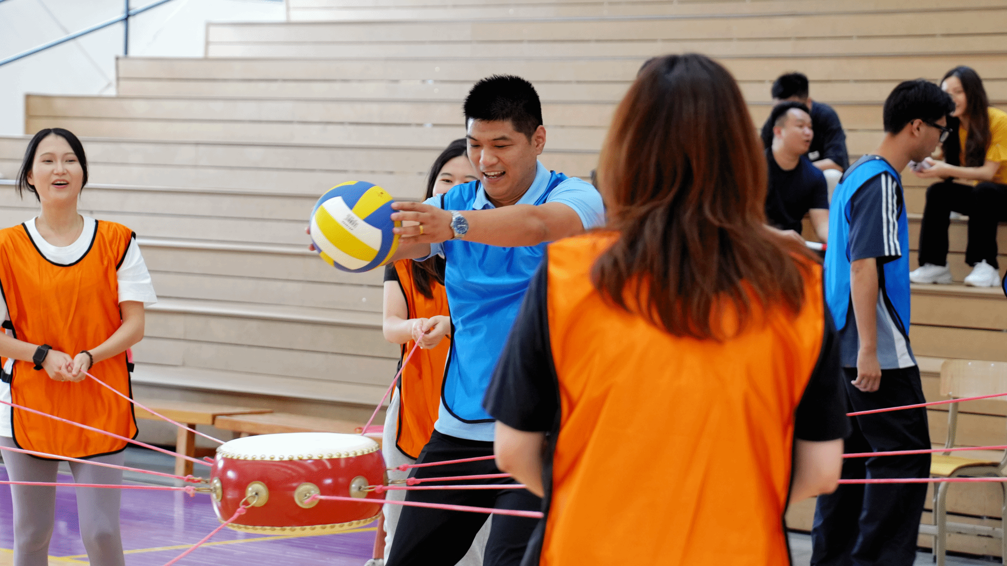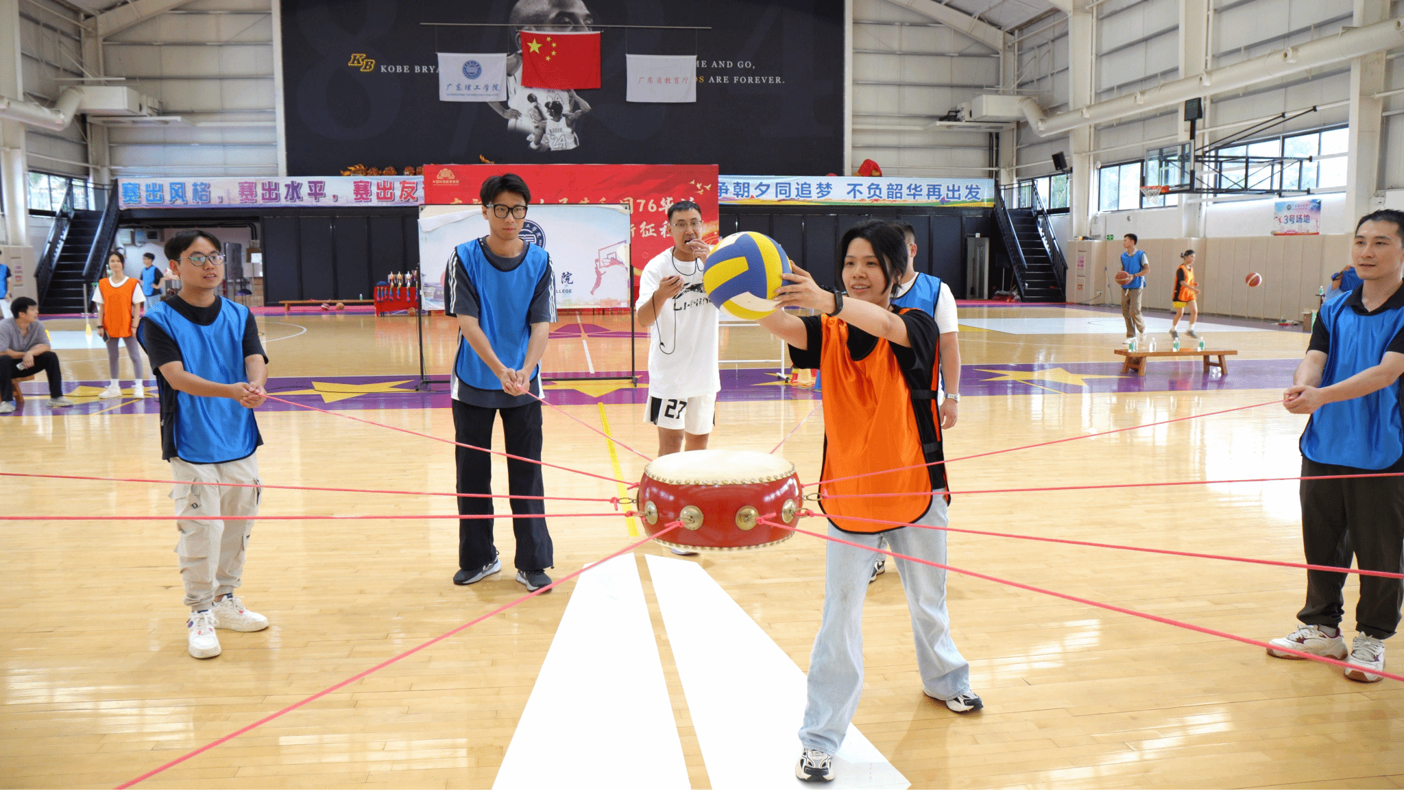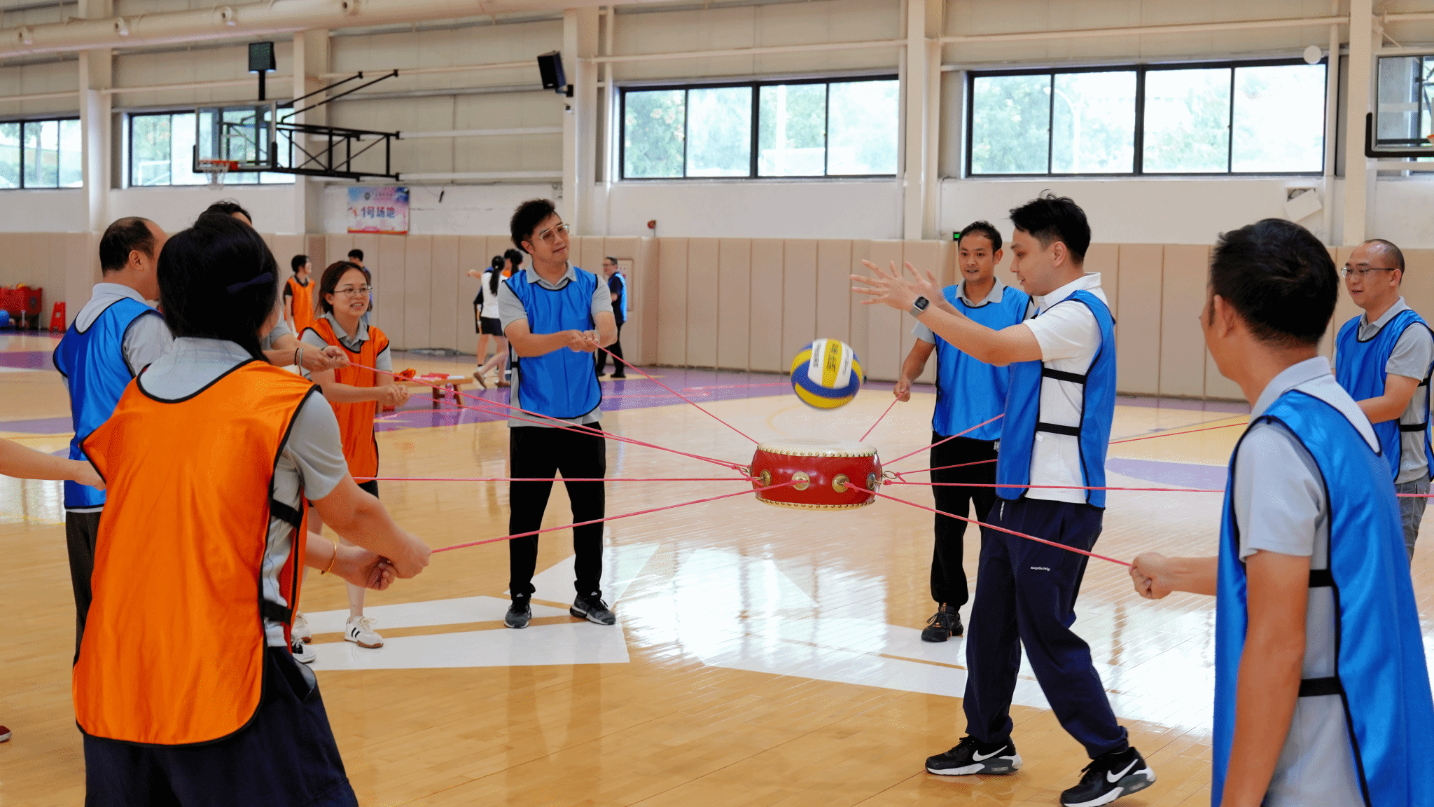 同心鼓:10人拉绳,1人捡球,团队默契尽显;3分钟倒计时中,各组队员全神贯注,默契配合,球起球落间尽显团队凝聚力。