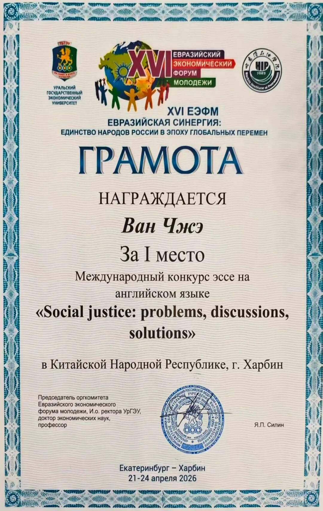 在竞争激烈的欧亚青年经济论坛英语征文国际大赛中,哈尔滨石油学院2023级新能源科学与工程专业王喆同学从参赛青年中脱颖而出,一举斩获大赛一等奖,获得丰厚奖金,同时获邀亲赴俄罗斯领奖。这一成绩不仅是该校国际化人才培养的成果,也是科培教育集团致力于培养具有国际视野卓越人才的生动体现。